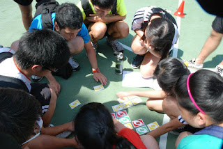 | Camp Eagle participants attempt to untangle themselves via a 4-way hula hoops! |